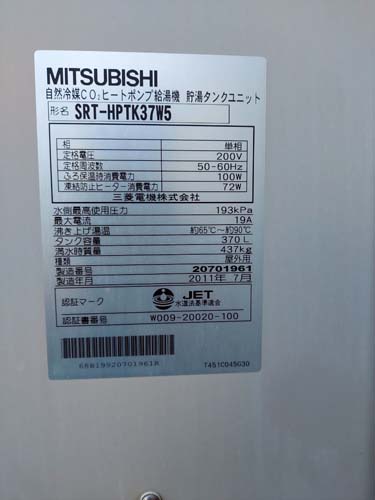 白河市本町 三菱電機自然冷媒CO2ヒートポンプ給湯機 貯湯タンクユニットSRT-HPTK37W5→パナソニック家庭用ヒートポンプ給湯機 ヒートポンプユニットHE-PLS45L エコキュート交換工事